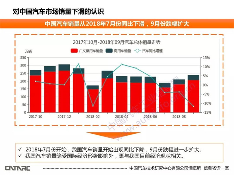 •     根據中國汽車工業協會的統計數據,2018年9月份,我國共銷售汽車2394062輛,比2017年9月份減少11.63%。其中乘用車銷售2060478輛,同比下降12.04%,商用車銷售333584,同比下降9%。